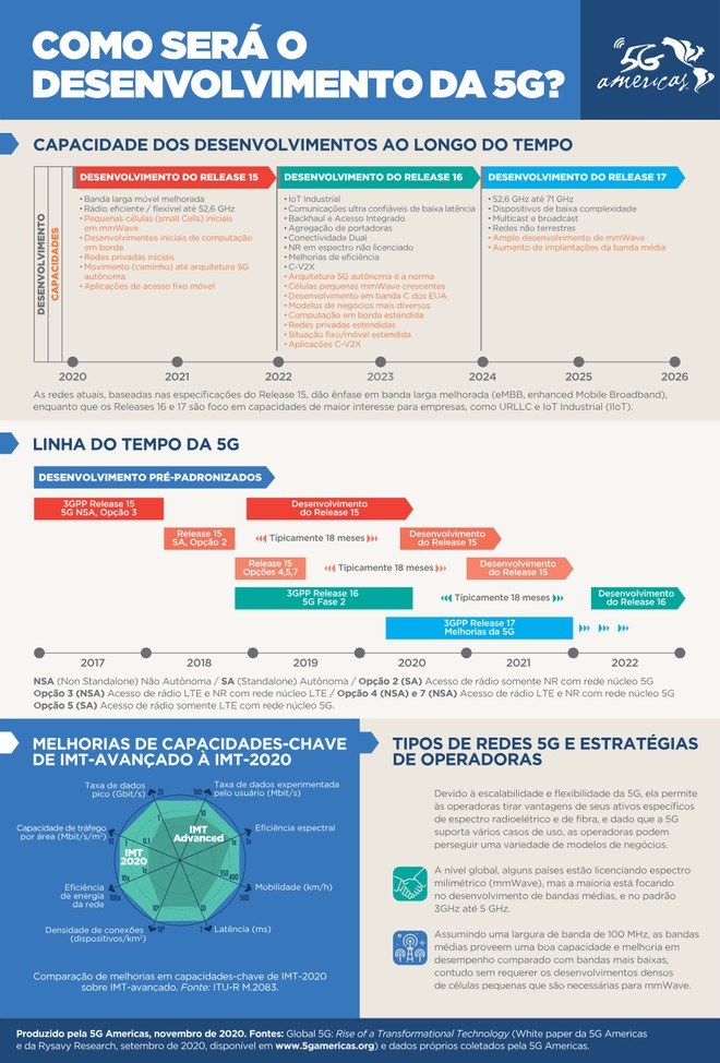 O 5G Americas, que é a associação setorial dos principais provedores de serviços e fabricantes do setor de telecomunicações, revelou informações importantes para que entendamos o desenvolvimento em três fases. De acordo com a organização, as primeiras instalações de infraestrutura 5G contam com 114 redes comerciais ativas ao redor do mundo. Esse tipo de tecnologia está em constante evolução, devendo ganhar novas características no futuro. Entenda abaixo como será o processo das três fases.